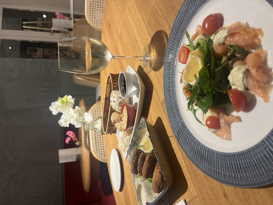 The image depicts an indoor dining scene at a restaurant in Saint Paul's Bay, Malta. The focal point is a wooden table laden with various food dishes and a beverage, illuminated by artificial lighting. In the foreground, a white circular plate with a blue textured rim presents a salad consisting of folded smoked salmon pieces, a bed of green arugula, several halved cherry tomatoes, scattered capers, and a light green creamy dressing, topped with a lemon wedge. To the left, a rectangular, light-colored dish with blue patterning contains six oblong, breaded, and deep-fried items, accompanied by a small portion of white dipping sauce and a lemon wedge. Further back on the table, a white rectangular platter holds a small wicker basket filled with several bread rolls, some topped with seeds, and a piece of flatbread. Adjacent to the basket are two small bowls: a red one containing a pale yellow dip (likely hummus) and a white one filled with black olives. To the right, a clear stemmed wine glass, showing condensation, is filled with a pale yellow liquid, indicative of white wine. The background reveals a blurred view of the restaurant interior. Several rattan-backed dining chairs are visible, along with red upholstered banquette seating against a dark grey-green wall that features a subtle textured pattern. On a table in the background, a small glass vase holds white and light green flowers, while a smaller vase with pink flowers is also visible. Further back, through a doorway or window, a tall, slender outdoor heating lamp is discernible. No individuals are present in the frame.