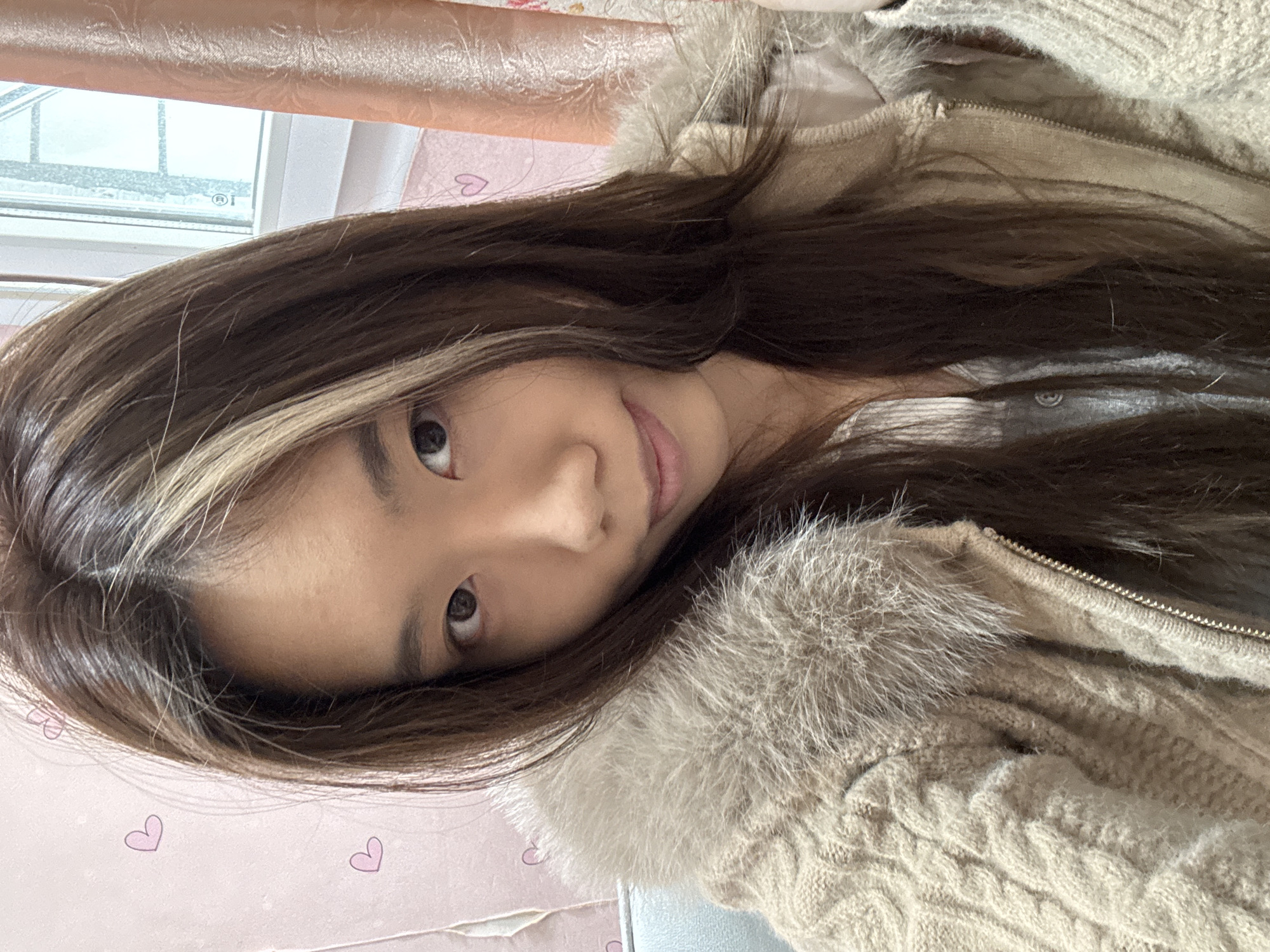 A person is visible, likely an Asian female, with long brown hair and a blonde streak, wearing a light beige cable-knit jacket with fur trim around the collar. The background includes a pink patterned wall with small heart shapes. A window with a blurry view is visible in the upper left corner. The photograph seems to be taken indoors. There is no information to ascertain that this picture was taken in the city of Shapingba District, China. There is nothing in the image which can reveal the location of this photograph. The focus is on the person and their attire, and no specific actions or interactions are evident within the frame.