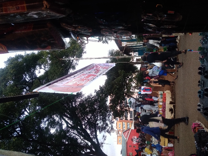 A bustling outdoor market scene unfolds with vendors displaying an array of goods. Clothes and shoes are prominently featured. People stroll through the market. A large banner hangs overhead, partially obscured by trees. Buildings are visible in the background, including one with a red facade. The image is taken from an elevated perspective, creating a slightly tilted view of the lively market.