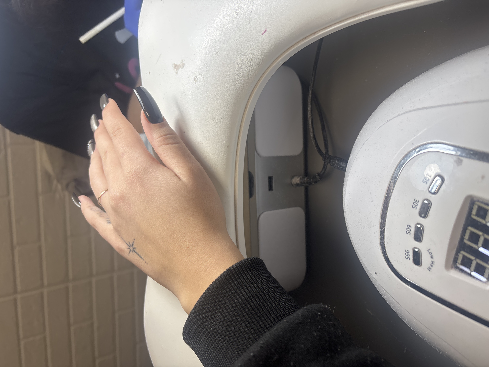 A photograph shows a person's left hand and arm resting near a white UV nail lamp. The person wears a black long-sleeved shirt, a gold ring on their ring finger, and has long, dark-colored nails. A small tattoo of a starburst is visible on the wrist. The nail lamp, which appears slightly worn, has a digital display and timer buttons. The surrounding environment includes what looks like white tiled walls, and the image appears to be taken indoors. Varna, Bulgaria is not evident in this image.