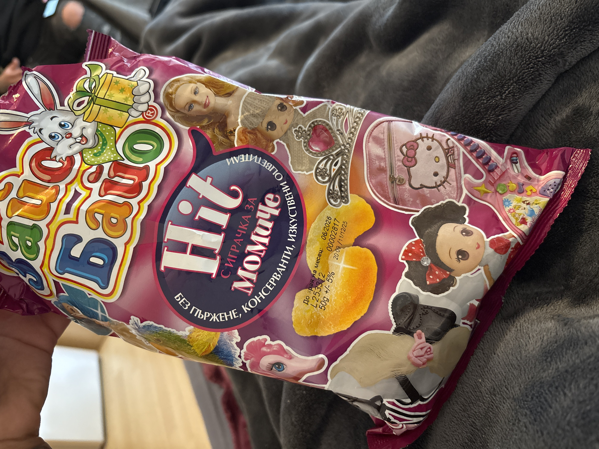 A human hand with a visible tattoo on the wrist holds a brightly colored, magenta-pink snack bag with Cyrillic text and cartoon imagery, positioned over a dark gray, textured fabric surface. The bag prominently displays "Зайко Байо" (Bunny Bayo) at the top and "Hit" centrally, accompanied by the Cyrillic phrase "С ИГРАЧКА ЗА МОМИЧЕ" (With a toy for a girl). Additional text indicates "БЕЗ ГЛЪРЖЕНЕ, КОНСЕРВАНТИ, ИЗКУСТВЕНИ ОЦВЕТИТЕЛИ" (No gluten, preservatives, artificial colors). The packaging features a cartoon white bunny holding a gift, a blonde doll's head resembling Barbie, a cartoon doll with a knitted hat and a tiara, a pink My Little Pony head, a horse's mane with a pink hair clip, a black shoe, a cartoon girl with pigtails and red bows, a pink Hello Kitty backpack, and a pink toy guitar decorated with Disney Princesses. Nutritional information includes a best-before date of 06/2026, a lot number L253312, and a net weight of 50g +/- 5%. The packaging also indicates a production date of 20:09 /11/12/23. The illustration inside the bag depicts several golden-yellow, irregularly shaped snack pieces. The background is out of focus, showing a white wall and light wooden flooring, consistent with an indoor environment. The image contains no discernible visual elements to determine a specific location within Kempten (Allgäu), Germany.