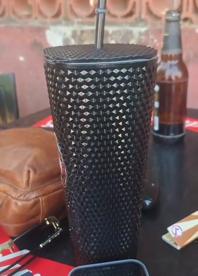 A dimly lit scene captures a black table holding a black studded tumbler with a straw, a brown leather bag, a phone, cigarettes, and a brown glass beer bottle. The background shows an orange patterned brick wall. Music plays in the background.
