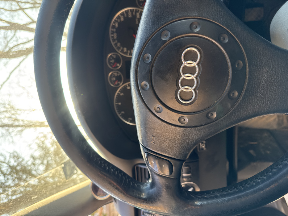 The image displays the interior of a vehicle, specifically focusing on the steering wheel and a portion of the dashboard, located in Mezdra, Bulgaria. The central subject is a black, leather-wrapped steering wheel featuring the prominent silver Audi four-ring logo on its airbag cover. The word "AIRBAG" is embossed at the bottom of the cover. On the left side of the steering wheel, a rocker switch with "+" and "-" symbols for volume control is visible, alongside an embossed horn symbol. The instrument cluster behind the steering wheel shows several analog gauges, including a speedometer partially visible up to 220 units. To the far left, a small, circular aftermarket gauge is mounted on the dashboard or A-pillar. Through the windshield, bright sunlight illuminates bare tree branches against a bright sky, indicating an outdoor, daytime setting. No individuals are present in the frame.