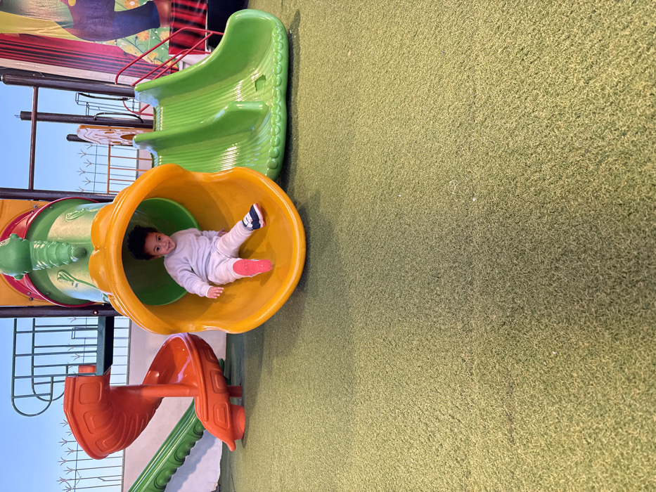 A child is playing on a playground. The child is lying inside a bright yellow tunnel slide, wearing a light-colored outfit and colorful shoes. The playground equipment also includes a green slide, an orange climbing structure, and green connectors. The surface under the equipment appears to be artificial turf. The sky is visible in the background.