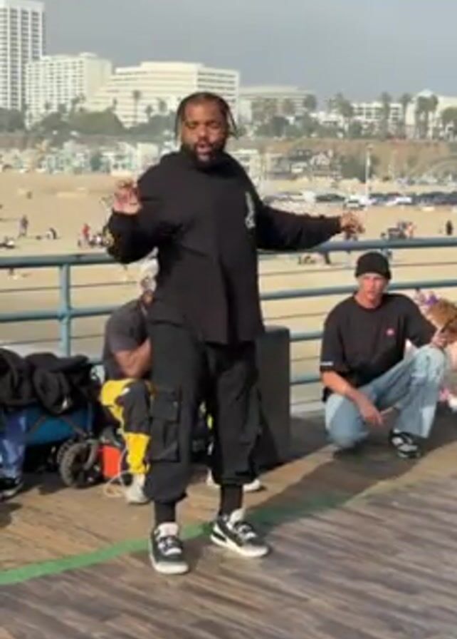Here's a concise description of the video: On a wooden pier with a beach in the background, a heavyset man with braided hair and a black hoodie is dancing
