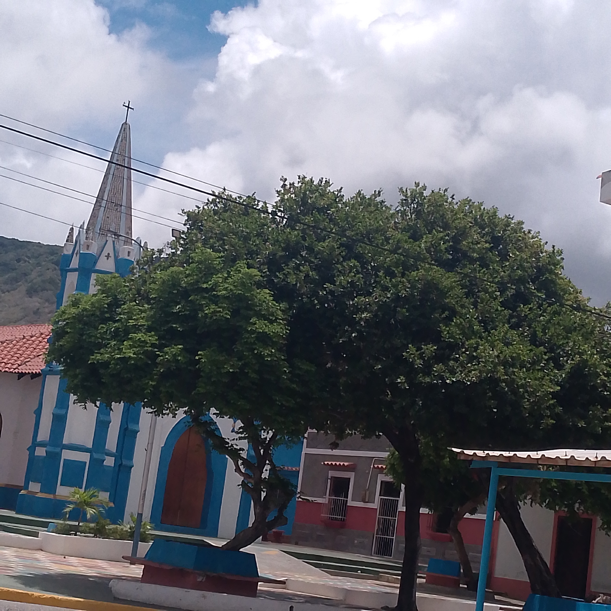 daytime scene in Tacarigua, Venezuela, featuring a church and surrounding structures. The church is painted white with blue vertical stripes and a tall, pointed spire topped with a cross. A large, full tree dominates the foreground, partially obscuring the view of the church. Behind the tree, a building with a red and gray facade is visible. The ground is paved with a patterned tile surface. Power lines run across the top of the frame. The sky is cloudy.