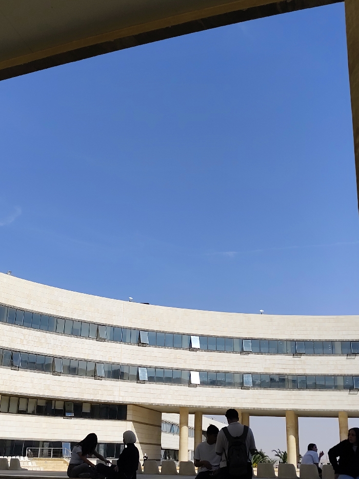 The image depicts an outdoor scene at the Al-Baath University campus in Jibb as-Safa, Syria. The foreground and mid-ground are dominated by a large, curved, multi-story building constructed with light-colored stone or concrete. This building features multiple horizontal bands of dark-paned windows, with several windows on the upper floors open and tilted outwards from the bottom. The ground level of the building includes a recessed area supported by light-colored circular pillars, forming an open-air walkway or colonnade. The upper two-thirds of the frame consist of a clear, bright blue sky with minimal cloud cover. The very top of the image is framed by a dark, horizontal architectural overhang or beam. In the lower foreground and mid-ground, approximately ten individuals are visible. On the left, three individuals are seated or resting on a low, light-colored, curved structure; one of these individuals wears a light-colored head covering (hijab). In the center-mid-ground, two male figures are partially visible, one wearing a dark backpack, appearing to be standing or sitting. Further to the right, additional figures are present, some seated in an open area, while others are partially obscured by the building's pillars. Sparse green foliage, possibly palm trees, is visible through the ground-level openings on the right side of the building. People appear to be gathered or resting in a casual manner within an outdoor plaza or courtyard area.