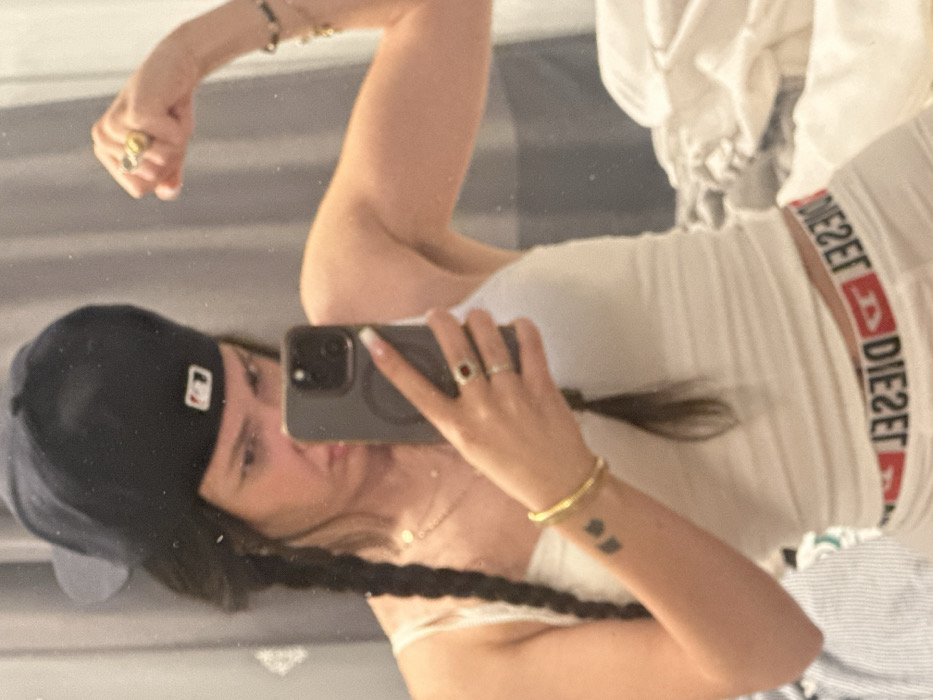A female individual is depicted in a mirror selfie taken indoors within the city of Las Vegas, United States. She wears a dark blue baseball cap, reversed, with a white MLB logo on the right front panel. Her dark hair is styled in two braids, one visible on her left side. She wears a white tank top, revealing a white lower garment with a red and black waistband displaying the reversed text "DIESEL." Her left arm, positioned to the viewer's right, is flexed at the elbow with a clenched fist, displaying a bicep. This hand wears multiple rings and a bracelet. Her right hand, positioned to the viewer's left, holds a dark-colored smartphone, covering most of her face, with only her eyebrows and part of a serious expression visible. She wears rings on her right hand, including one with a dark red stone, and a gold-colored bracelet on her wrist. A small, dark tattoo of two conjoined circles is visible on her right forearm. The background, visible in the mirror, shows indistinct shapes; a striped garment is partially visible on the left, and crumpled white fabric is on the right, suggesting a private room setting.