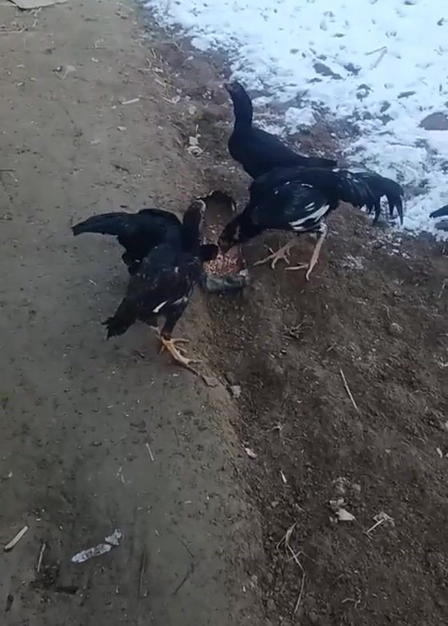 Four black chickens with some white accents are eating from a metal container on a patch of dirt and sparse vegetation. One chicken stands upright in the snow. The foreground shows a dirt path, and the background shows snowy ground.