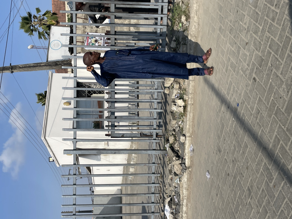 The image depicts a bright, sunlit street scene in Badore, Nigeria. In the foreground, a paved street with a herringbone pattern is visible. A dark-skinned male subject, bald and dressed in a dark blue tunic and trousers with matching sandals, stands on the pavement. He faces right, with his right arm raised, his hand positioned near his temple, potentially shading his eyes or scratching his head. He holds a dark object, likely a phone, in his left hand. A long shadow from this individual extends across the pavement. Behind the man, a grey metal fence with vertical bars separates the street from an adjacent property. The curb and sidewalk immediately behind the fence are broken and uneven, covered in rubble, dirt, and scattered litter, including white paper. A grey utility pole with overhead power lines stands near the center of the frame. In the background, behind the fence, a white building with a flat roof is visible. It features a floodlight mounted on its roof and two yellow wall-mounted lights. Windows with security bars are present on this building. To the right of the white building, another building is partially obscured by the fence and a utility pole, displaying a circular sign with some illegible text, possibly including "INSTITUT." Palm trees are visible beyond the buildings, silhouetted against a clear blue sky with sparse white clouds. A second individual is partially visible behind the fence on the far right, wearing a dark top and a cap.