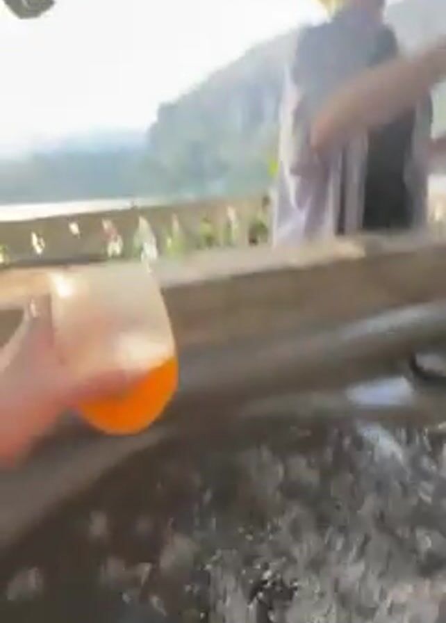 person holding a glass of orange liquid in front of a bubbling hot tub