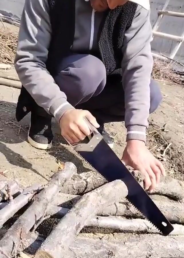 A man is crouched down on a dirt surface outside, sawing small tree branches with a handsaw