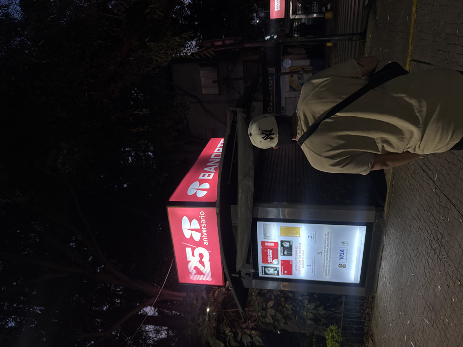 An individual is depicted from behind, standing on a paved sidewalk in Mexico City at night. The person wears a light-colored short-sleeved shirt, a black crossbody bag, and a light-colored baseball cap featuring a dark brim and an "NY" logo. They face a prominent street kiosk. The kiosk is topped by a bright red illuminated sign displaying "125 aniversario" and the word "BANORTE" alongside its 'B' logo. Below this, a vertical digital display panel, also illuminated, shows Banorte credit card promotions and a FIFA World Cup advertisement with numbered steps (1, 2, 3) and Visa branding. To the right of the digital display, a section of the kiosk appears shuttered. Dark tree canopies and a distant building are visible against the dark sky.
