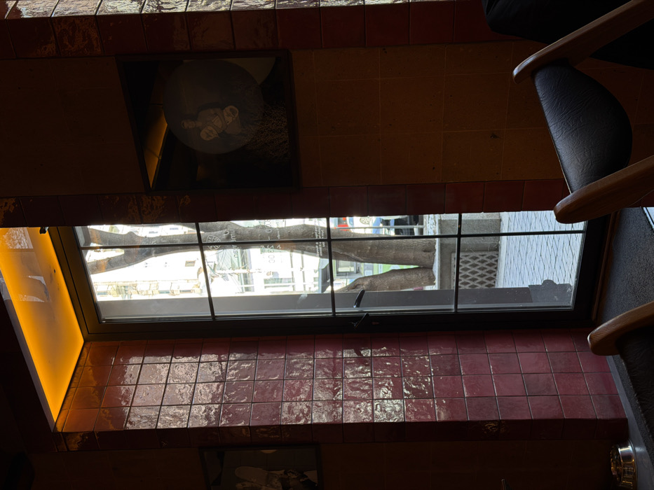- "The image depicts an interior view of a commercial establishment, likely a restaurant or cafe, looking outwards through a tall, glass-paned door or window" by FM-Qo5JH3, licensed under CC BY 4.0