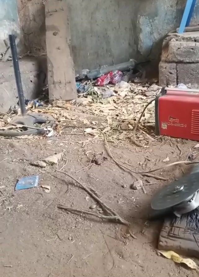 interior of a messy room. The floor is dirt, littered with debris like sticks, leaves, plastic pieces, and what appears to be trash. Against the back wall there is an old, weathered wooden plank. A red welding machine sits on the floor to the right. Other items include a metal stand, a grinding wheel, and various unidentified objects scattered around. There's a blue metal structure partially visible in the upper right corner, possibly part of scaffolding. The room's walls appear old and damaged with visible cracks and discoloration. A tapping sound is audible, suggesting that someone is hitting or working on something nearby.