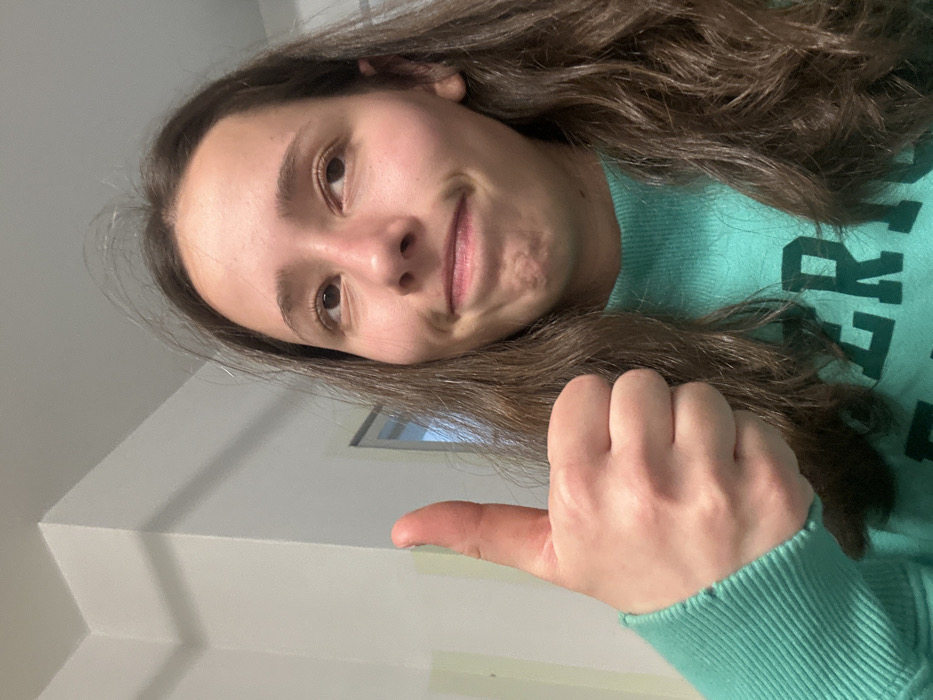 The image depicts a young female, estimated to be in her late teens or early twenties, with long, wavy brown hair. She is positioned centrally, facing slightly towards the left, with her head tilted upwards and eyes directed towards the upper right. Her facial expression is a subtle smirk or soft smile, with the corners of her mouth slightly upturned and her chin lightly creased. Her left hand is raised to chest height, displaying a clear thumbs-up gesture, indicating approval or positivity. She wears a teal-colored long-sleeved sweatshirt, featuring an indistinct dark graphic or lettering on the chest. The background is an interior room with plain, light-colored walls and a ceiling. A corner of the room is visible to the upper left, showing a vertical join between two wall sections. A narrow, dark vertical line to the right of her thumb suggests a door frame or window frame in the background. Lighting appears even, suggesting an indoor light source. The image contains no discernible features or markers that would allow for specific identification of a location within the city of Tel-Aviv, Israel.