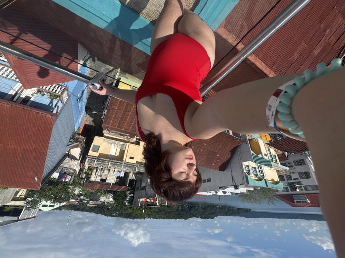 A woman in a red swimsuit is seen from an elevated perspective. She's holding a metal object in one hand and wearing a light blue beaded bracelet on the other. Below her is a cluster of buildings with different colored roofs, followed by a body of water, and a sky filled with clouds. The overall composition is oriented at an odd angle.