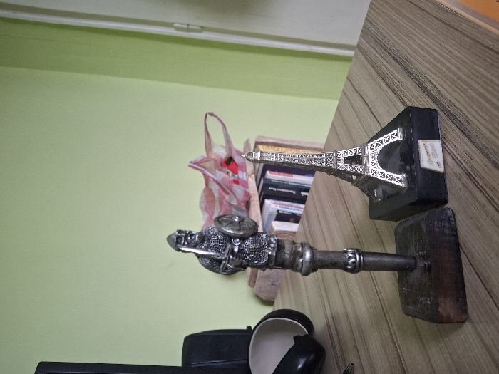 The image displays two decorative statuettes positioned on a light brown, wood-grain patterned surface within an interior room in the city of Mokresh, Bulgaria. To the left, a metallic, dark silver-toned figurine depicts a warrior or knight, clad in a helmet and chainmail, holding a sword in the right hand and a circular shield in the left. This figure is mounted on a slender, ornate metallic column attached to a dark, weathered rectangular wooden base. To the right, a silver-toned miniature replica of the Eiffel Tower stands on a rectangular black base, which features a small white plaque on its front. The background consists of a solid light green wall, with a partial view of a white door frame or door edge on the far right. Behind the statuettes, a shelf containing several vertically arranged books is partially visible, along with a crumpled red and white striped bag. On the far left, a dark, vertical object, possibly part of an electronic device, and a two-toned white and black bowl are partially discernible.