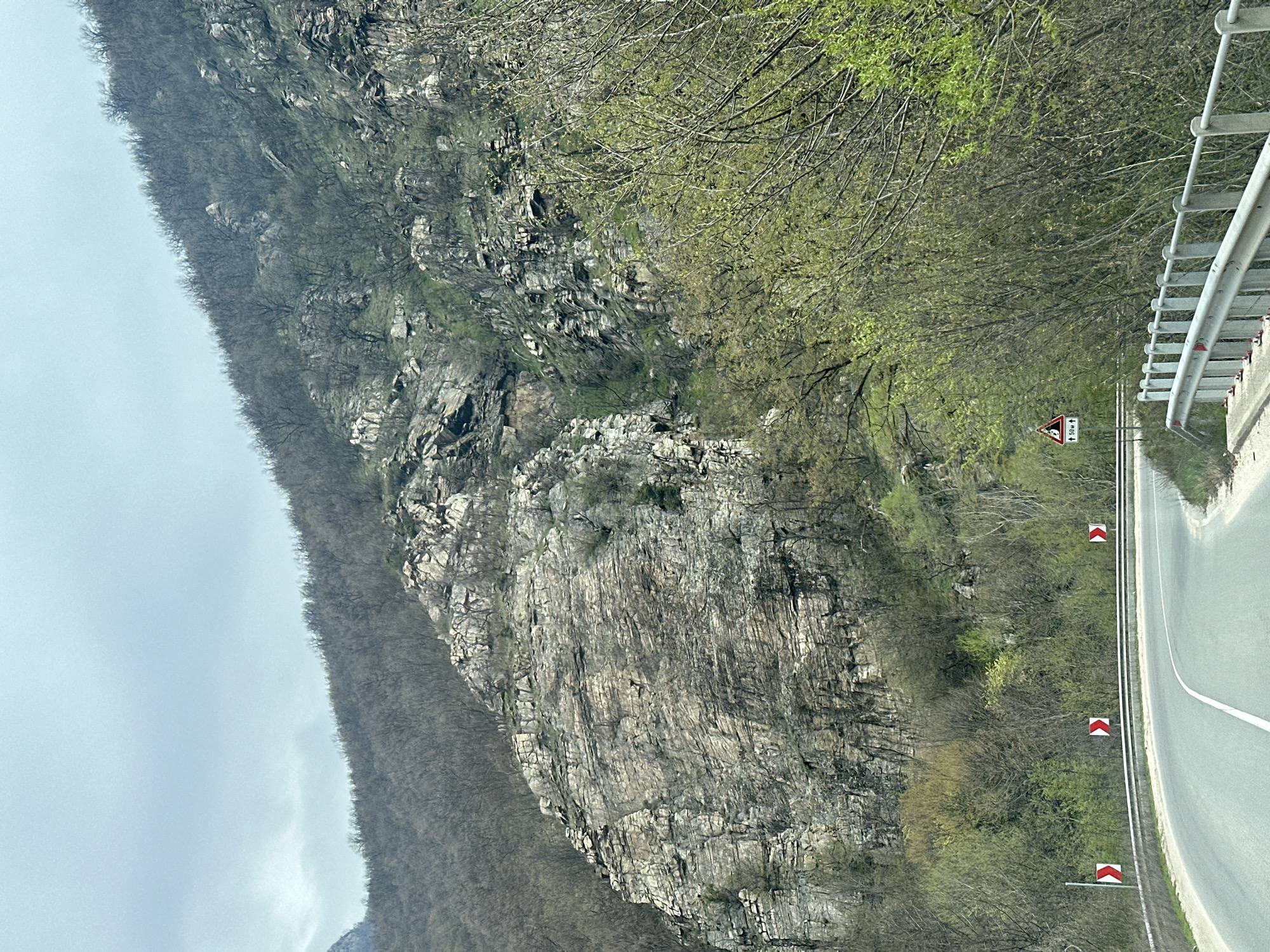 road next to a rocky cliff in Dorkovo, Bulgaria. The road has a white line divider and reflector signs indicating curves. A metal guardrail is present on the right side of the road. The cliff is covered in rock formations and sparse vegetation. Bare trees are on the left side of the cliff. A sign indicating a dangerous area ahead is also visible. The sky is overcast.