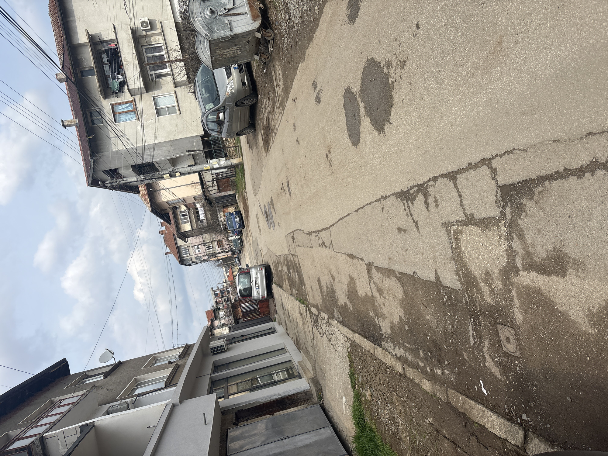 This image depicts a residential street in Montana, Bulgaria, under an overcast sky. The asphalt road is visibly worn, patched, and features multiple wet depressions and puddles. Concrete sidewalks flank the road, exhibiting cracks and bordering patches of exposed dirt and sparse green grass. On the immediate left, a multi-story building displays a light grey lower facade, possibly commercial, with large glass windows and two grey metal panel doors. The upper portion is a darker grey, featuring multiple windows and a white satellite dish, with an external air conditioning unit mounted below. Further down the left side, a silver minivan with a Bulgarian license plate (M 3674 SM) is parked, facing away from the viewer. On the right side of the road, two large, weathered, metallic grey municipal trash bins on wheels are positioned on a dirt strip. Adjacent to them, a silver passenger vehicle, possibly a Toyota, is parked, facing the viewer, with its front partially obscured by the bins. Behind this vehicle, a multi-story residential building features a light grey facade, multiple windows (one with blue curtains), and a balcony on the first floor where laundry hangs to dry. Another air conditioning unit is visible on this building. A utility pole heavily laden with overhead wires stands in front of the building. Further down the street, additional multi-story residential buildings with red-tiled roofs and more parked cars are visible, receding into the distance. No individuals are present in the scene.