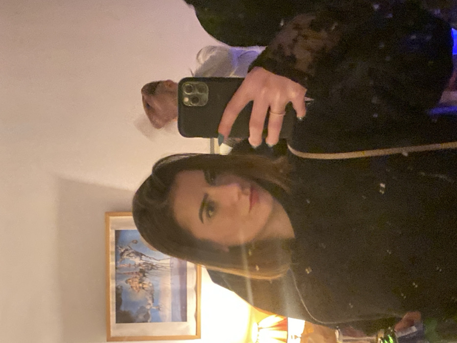 A selfie taken in a mirror reflects a woman with shoulder-length brunette hair and fair skin