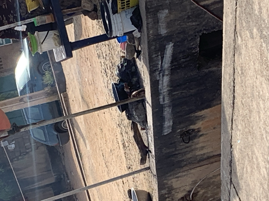 A person stands near a concrete structure. There is a dirt road with a car parked on the left side. The person is wearing dark clothing, and a metal pole is visible in the foreground. Other objects such as buckets and containers are visible on top of the concrete structure. The image is rotated.