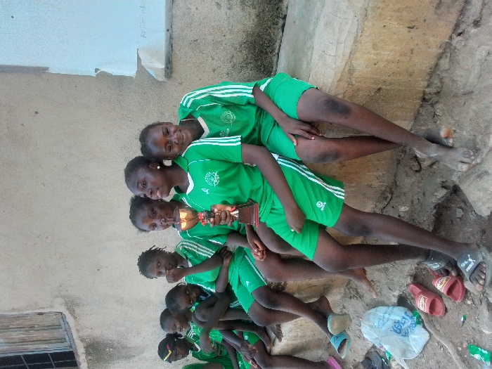 A group of approximately seven young girls is depicted sitting on a concrete ledge against a light-colored, textured concrete wall, likely outdoors in Akwanga, Nigeria. The girls are dressed in matching green athletic jerseys with white trim and green shorts with white stripes. One girl, positioned slightly to the right of the center, holds a golden-colored trophy with a dark base. Several girls are looking towards the viewer, some smiling, while others look away. A small, dark-framed window is visible in the upper left of the wall, and a piece of white paper or fabric, possibly a sign with faint text, is taped to the wall on the upper right. The ground below the ledge is dirt, scattered with minor debris including a white plastic bag and red sandals. Some girls are barefoot, while others wear flip-flops. The scene appears to capture a moment of rest or celebration after a sporting event.