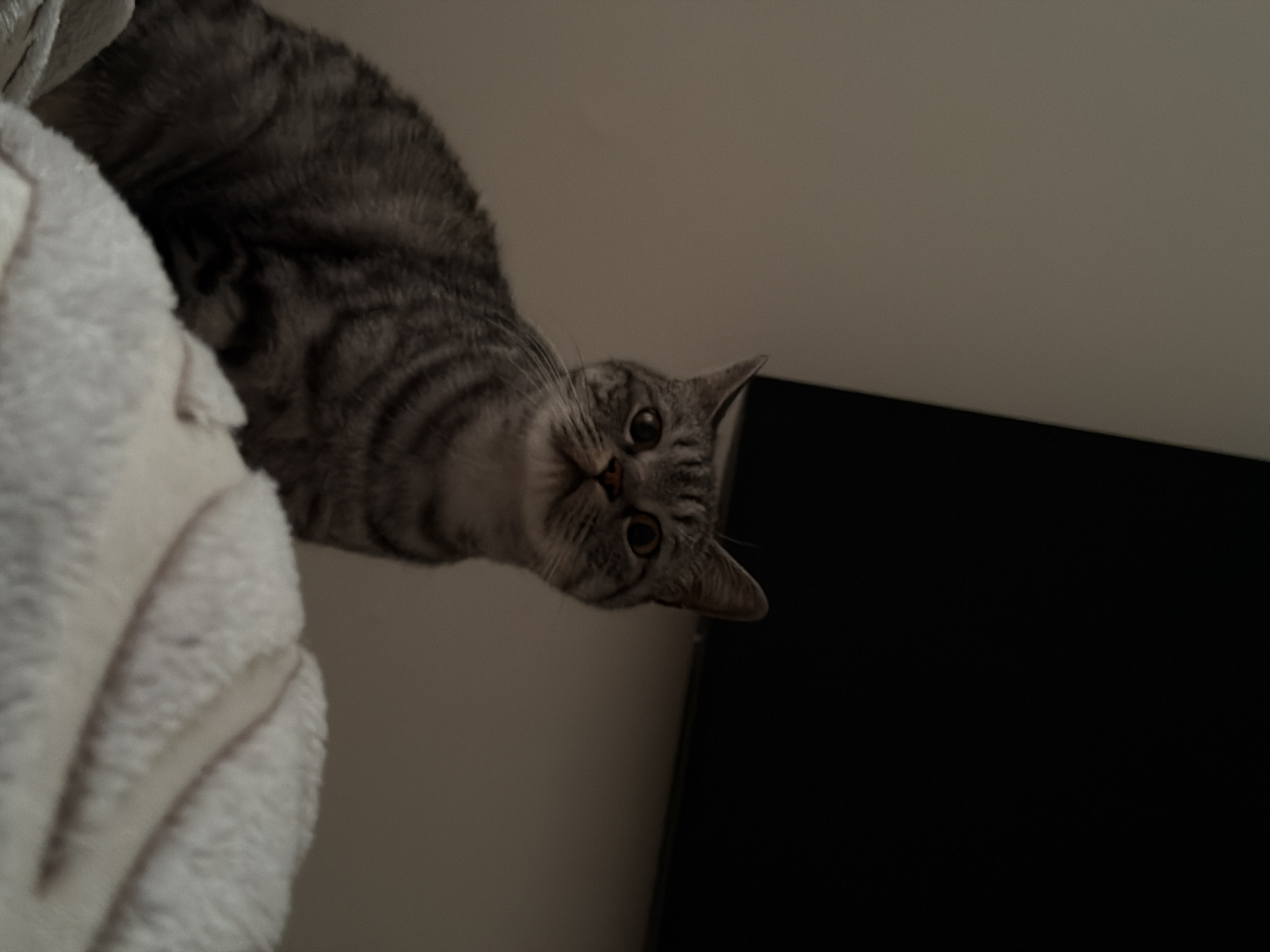 A gray tabby cat is perched on a fluffy white object, possibly a blanket or cushion. The cat is looking down towards the camera with its head tilted. Behind the cat and the white object is a plain beige or light-colored wall, and to the right is a large dark object, possibly a television. The location is unknown, and there is no evidence to support that the photo was taken in Yuzhny, Russia.