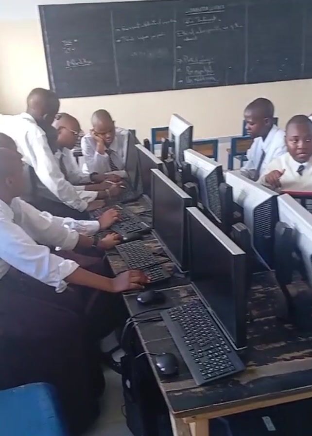 classroom setting where a group of students are working on computers. Most of the students are seated at desks, typing on the computer keyboards. They are wearing school uniforms consisting of white shirts, ties and dark skirts or pants. A teacher or supervisor is present, standing behind the students. The classroom contains several computer workstations arranged in rows. There is a chalkboard on the wall with writing on it, possibly related to computer science. The overall environment is typical of a school computer lab.