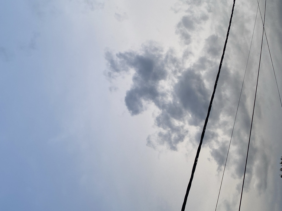 A cloudy sky dominates the scene, with varying shades of gray suggesting an overcast day. A thick black power line runs diagonally across the view, accompanied by thinner wires adjacent to it. The clouds display irregular shapes and densities. A hint of green foliage is visible in the bottom right corner, possibly a tree.