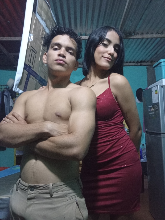 A shirtless man with crossed arms stands next to a woman wearing a red, glittery, form-fitting dress. The man is wearing beige pants. They are indoors, with a refrigerator visible in the background and a metal corrugated ceiling above. There is a large cardboard box, and a clothes rack is also present.