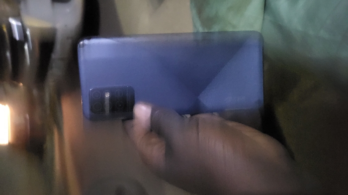 A dark blue or gray smartphone is held in someone's hand. The camera module with multiple lenses is visible. The phone's back is mostly obscured by the hand, and some reflections or smudges are on the surface. A blurry background includes possibly a table and a dark green or brown object, suggesting the picture was taken indoors. The image appears slightly out of focus, making details difficult to discern.