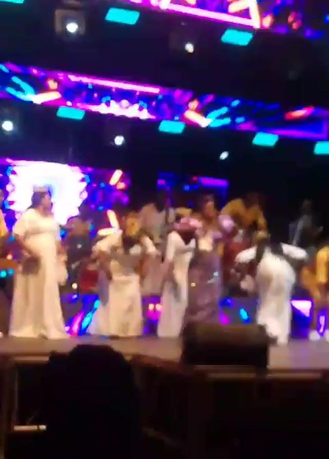 A group of people are performing on stage, illuminated by bright lights. Some performers are dressed in white robes, while others wear colorful outfits in purple and yellow. A band is set up behind them, with a drummer visible. The stage has a screen behind the performers displaying a bright, abstract pattern. The audience is dark and indistinct in the foreground. The performers are dancing and moving around the stage.