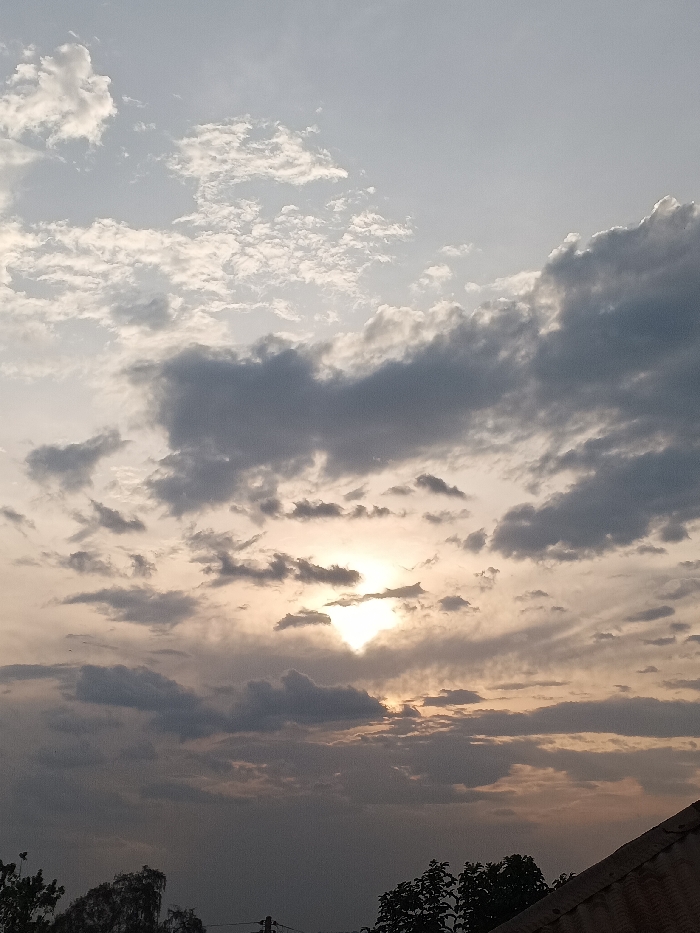 The image displays a sky scene over Nsukka, Nigeria, at what appears to be either sunrise or sunset. The sun is visible as a bright, diffused light source, partially obscured by clouds in the upper-mid right section of the frame. The sky is heavily clouded with a mix of light grey, white, and darker grey clouds, presenting varied densities and formations across the expanse. The lower edge of the frame includes dark, indistinct silhouettes of tree foliage and what may be utility lines. A section of a corrugated metal roof is present in the bottom-right corner, angled diagonally upwards. No people, specific subjects, actions, or interactions are discernible within the visible scene.