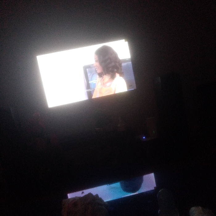 In a dimly lit room, a television screen displays a woman with dark, curly hair. She is wearing a yellow top and appears to be on a show, with the words "HOLLY T" visible on the screen. Below the TV, there's a blurry view of items including a possible beverage and covered legs in the darkness, suggesting someone is watching the TV.