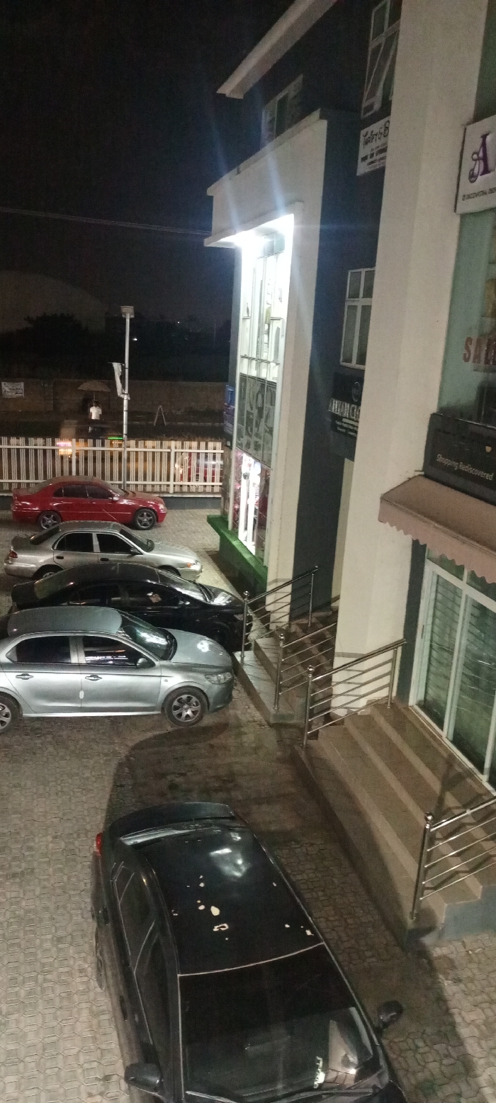 The image captures a nighttime scene in Barden Yana, Nigeria, showcasing the illuminated facade of a multi-story commercial building and an adjacent parking area