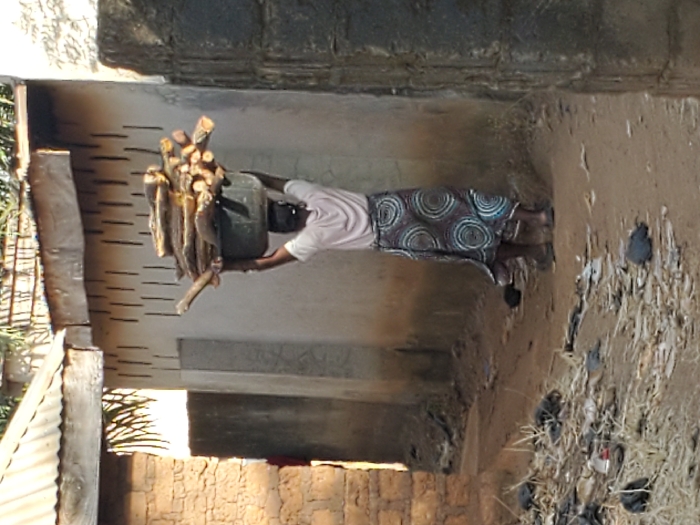 An individual, presumably a woman, carries firewood on their head in what appears to be a rural setting