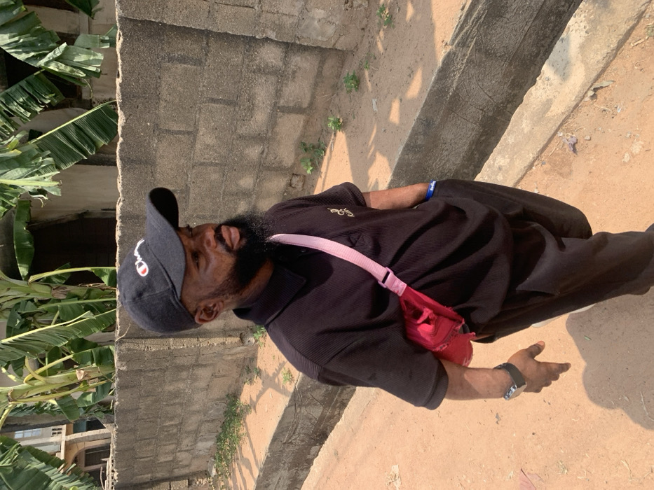 A male individual stands on a reddish-brown dirt path in Eika-Adagu New Layout, Nigeria