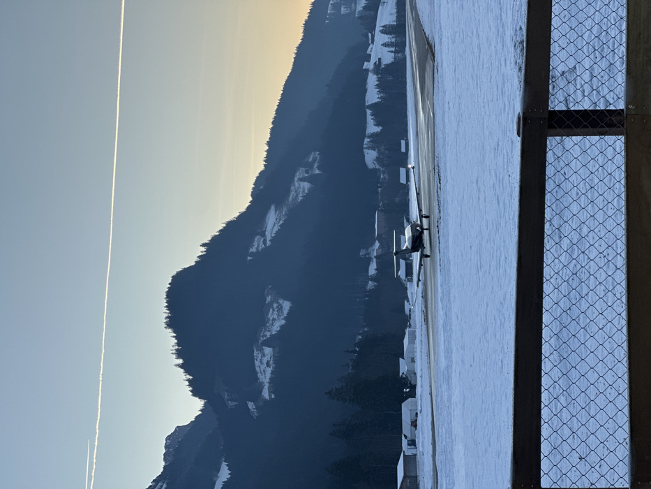 The image captures a winter landscape at Saanen Airport (LSGK) in Saanen, Switzerland. In the immediate foreground, a wooden fence with a wire mesh runs horizontally, partially obscuring a snow-covered field. A dark, single-engine propeller aircraft, possibly a turboprop, is positioned on a cleared asphalt runway in the midground, facing away from the viewer. Its landing lights are illuminated. The runway is bordered by extensive snow-covered terrain. To the left of the runway, several small, light-colored structures, likely hangars or airport buildings, are visible amidst the snow. The background is dominated by dark, forested mountains with substantial snow patches on their slopes. Scattered traditional wooden buildings are visible on the lower mountain sides. The sky presents a clear gradient, transitioning from a light blue at the top to a soft orange-yellow near the horizon, suggesting either sunrise or sunset. A distinct white contrail stretches horizontally across the upper sky. No individuals are discernable within the frame.