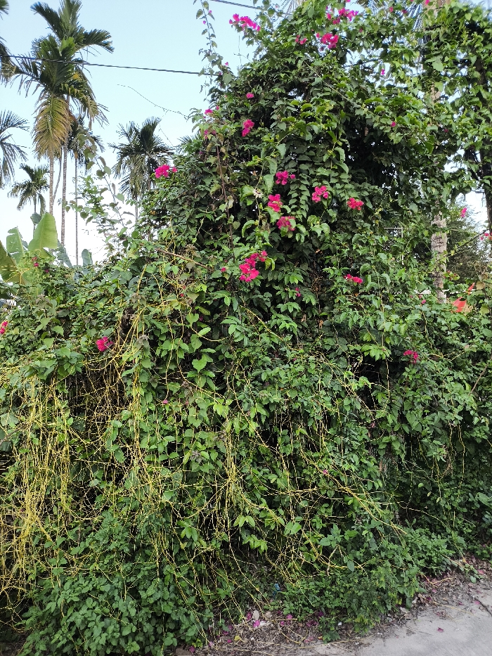 The scene depicts a dense overgrowth of vegetation alongside what appears to be a paved surface in Thành phố Quảng Ngãi, Vietnam. A large, robust green bush or vine dominates the frame, heavily adorned with numerous clusters of bright pink bougainvillea flowers, particularly visible in the upper and middle sections. Interspersed throughout the lower and mid-sections of the green foliage are extensive strands of a bright yellow, string-like parasitic plant, likely *Cuscuta* (dodder), intricately woven through the host vegetation. In the background, on the left side, several tall Areca palm trees with prominent trunks and fronds rise towards a clear, light blue sky. Below the palms, additional green foliage, including broad banana leaves, is present. The foreground reveals a narrow strip of concrete pavement or sidewalk along the bottom right edge, with scattered small pieces of dark reddish-brown debris. The lighting indicates clear daytime conditions. No individuals or animals are present in the image.