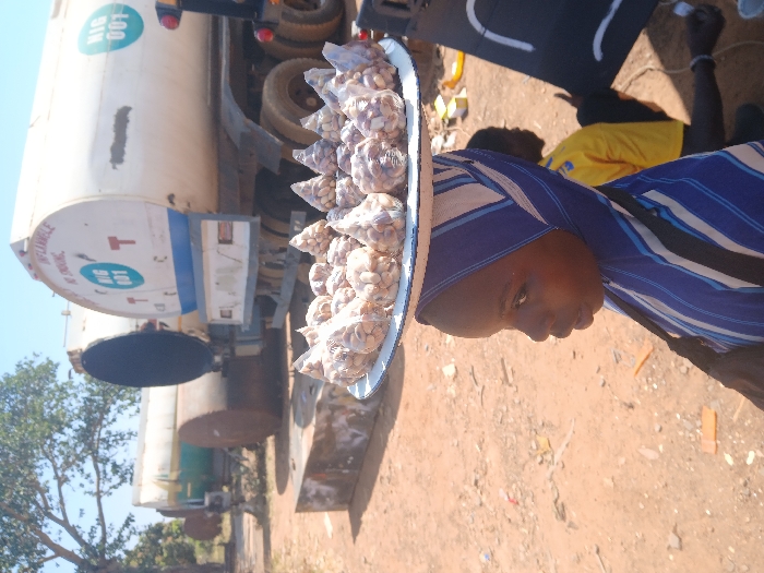 A young individual, situated in Unguwar Saya, Nigeria, is depicted in profile, carrying a white enamel tray with a blue rim on their head. The tray holds approximately two dozen small, clear plastic bags, each containing light-colored items, likely nuts or seeds. The individual wears a blue and white striped head covering and garment. The ground beneath is dry, reddish-brown earth. In the mid-ground, a second person, partially visible and wearing a yellow shirt, is seen kneeling or sitting. In the background, multiple large white tanker trucks are parked. The closest truck displays "INFLAMMABLE," "NO SMOKING," and "NIG 001" stenciled in red and blue. The sky is clear, with sparse trees visible in the far background.