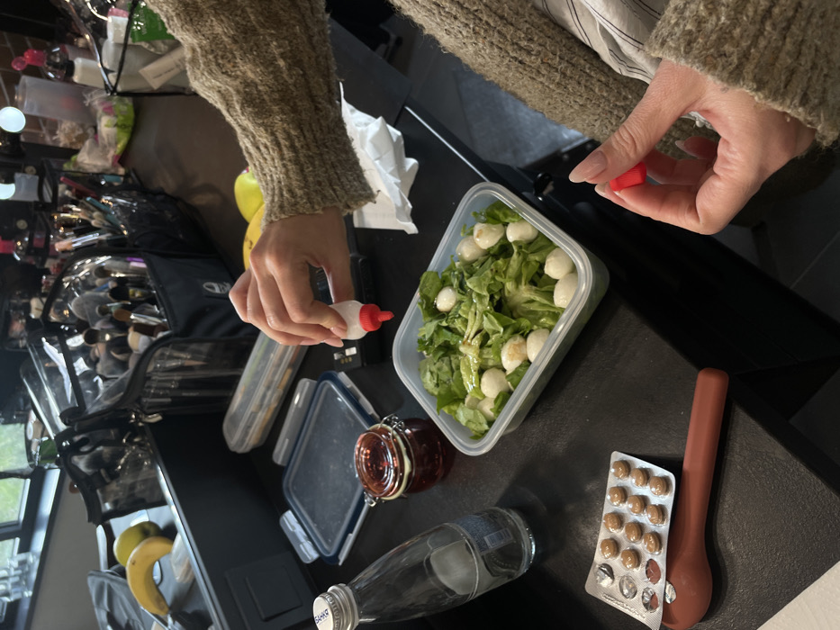 An indoor scene in Bozhurishte, Bulgaria, depicts a person's hands interacting with food items on a dark countertop. The primary subject is a human hand, likely female, with light-colored manicured nails, dispensing liquid from a small white squeeze bottle with a red nozzle onto a rectangular clear plastic container holding a salad of green leafy vegetables and small white mozzarella balls. A second hand, also with manicured nails, holds the red cap of the squeeze bottle. To the left of the salad container, an empty or partially full clear glass water bottle with a silver cap and a white label stands next to a small glass jar with a red lid, which contains a dark red, viscous substance. Further to the left, a blister pack containing approximately 20 small, round, brown pills is positioned on a reddish-brown silicone spoon or spatula. Several cavities in the blister pack are empty. In the background, behind the food items, a dark surface transitions into an area populated with multiple transparent plastic organizers filled with numerous makeup brushes of various sizes and types, suggesting a professional makeup station or dressing room. A large mirror is visible behind these organizers, reflecting a window with a view of outdoor greenery and some overhead light fixtures.