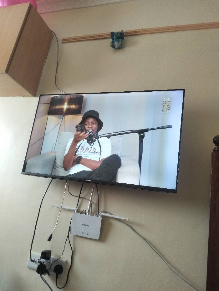 The scene depicts an interior wall in Nairobi, Kenya, featuring a wall-mounted flat-screen television prominently displaying a man speaking into a microphone. The television screen shows a male individual, appearing to be in their 20s or 30s, wearing a black bucket hat and a white short-sleeved shirt with dark trousers. He is seated on a light-colored sofa, holding a small dark object to his mouth while a large microphone on a boom arm is positioned directly in front of him. A floor lamp is visible in the background of the television content. A "THE P" logo, featuring a stylized elephant head, is present in the upper right corner of the TV screen. Below the television, a white Tenda brand Wi-Fi router with multiple external antennas is affixed to the wall. Numerous black and grey electrical cables descend from the television and router, converging at a white multi-socket power strip mounted lower on the wall. This power strip contains multiple Type G power sockets, two of which are occupied by black plugs, one being a large adapter. In the upper left portion of the image, a light-brown wooden wall-mounted cabinet is partially visible. Horizontally across the upper wall, a wooden trim strip is installed, from which a small blue plush toy, resembling an elephant, is suspended. The walls are painted a uniform, light, neutral color, possibly beige or off-white. The overall lighting is bright and even. A dark brown wooden furniture piece, possibly part of a bed frame or wardrobe, is partially visible on the right edge of the frame.