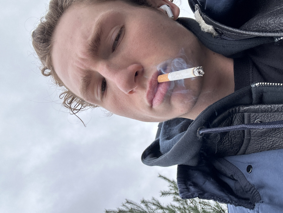 The scene depicts a close-up, low-angle selfie of a young adult male outdoors, stated to be in Clichy, France, under an overcast sky. The subject, positioned centrally, has light skin, curly light brown hair, and a visible five o'clock shadow. He looks directly towards the camera with a slightly furrowed brow, creating a concerned or intense expression. A lit cigarette is held between his parted lips, with smoke visibly exhaling or rising from the burning end. A white wireless earbud is present in his right ear. He is dressed in layered dark clothing, including a dark hooded sweatshirt under a dark, possibly leather, jacket with a visible textured collar lining on the right. Over his left shoulder, a portion of a blue padded jacket is visible. To the far left in the background, green foliage from a coniferous tree is partially visible against a uniformly grey, cloudy sky.