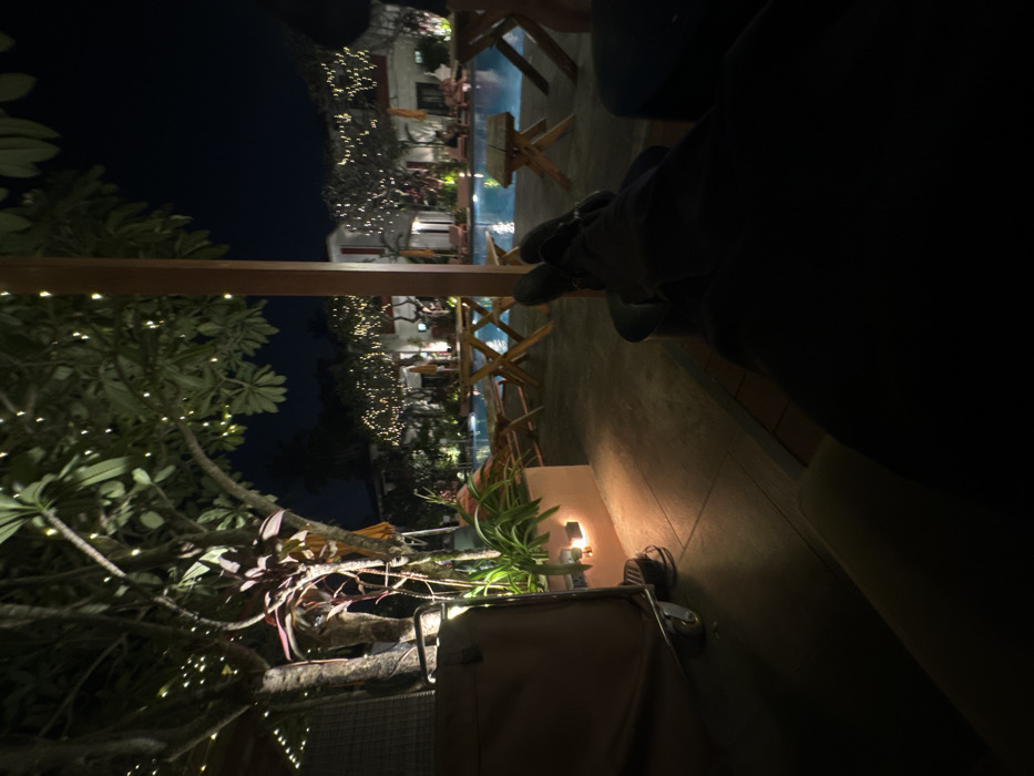 A dimly lit outdoor scene at night features a tree adorned with tiny lights on the left. In the background, a pool area with illuminated buildings is visible. Wooden structures and seating are positioned near the pool. The foreground contains a chair, and the darkness obscures details of someone relaxing with sandals, possibly with a drink nearby. The scene evokes a sense of tranquility and relaxation under the night sky.