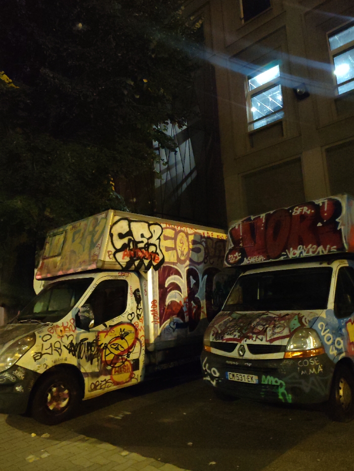 - "The image captures a nighttime urban scene in Strasbourg, France, featuring two graffiti-covered vehicles parked on a paved surface" by FM-S8GQG3, licensed under CC BY 4.0