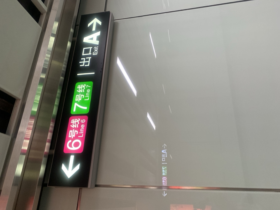 An illuminated sign directs travelers in a subway or train station. The sign indicates "Exit A" with an upward-pointing arrow. Below, "Line 7" is displayed in green and "Line 6" in pink, each with a downward-pointing arrow. The sign is mounted on a white wall with light reflections. The image's perspective is slightly angled, suggesting it was taken by someone standing below and to the left of the sign.