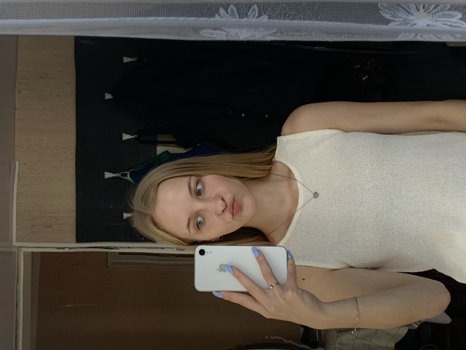 - "A young woman with long, straight light-colored hair and light eyes is depicted taking a mirror selfie in a casual indoor setting within the city of Bohuslav, Ukraine" by FM-BI1Cp2, licensed under CC BY 4.0