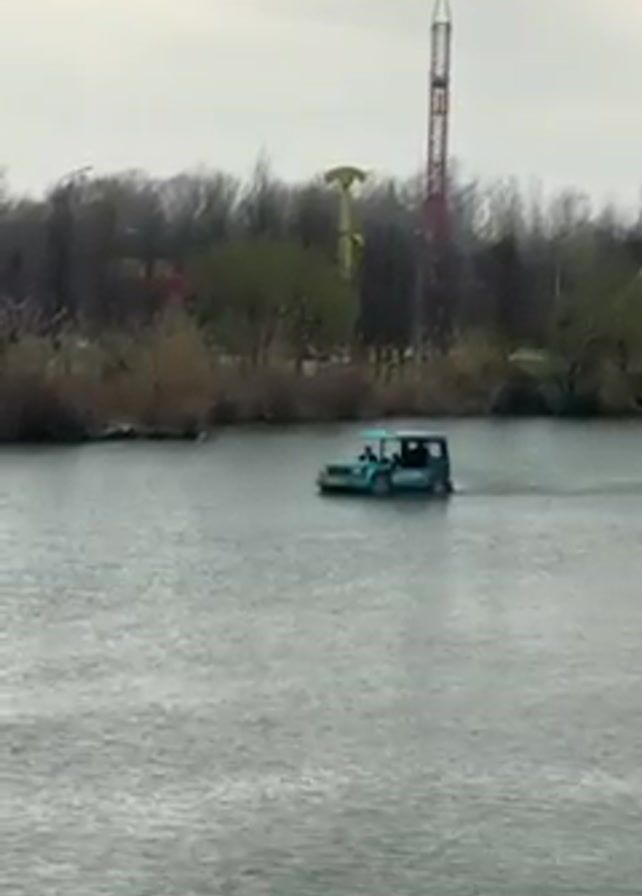 A small blue car-shaped boat with occupants is traveling on a body of water. The background includes trees, other vegetation, a tall red and white tower, and a green amusement park ride. The sky is overcast.