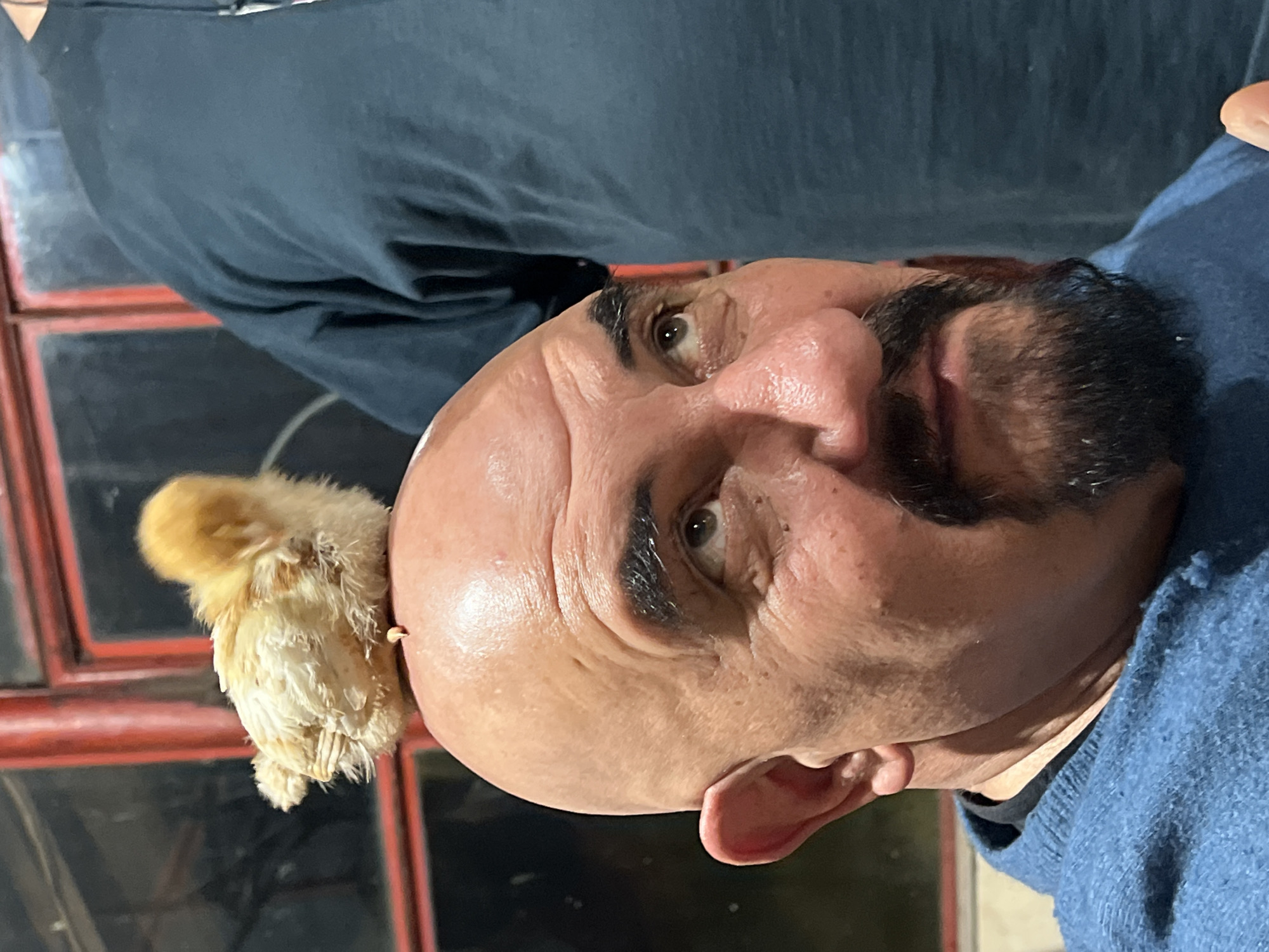 A close-up, slightly rotated image depicts a bald man with a dark mustache and beard. A small, fluffy, light-colored chick sits on the top of his head. The man's face is detailed, showing wrinkles and skin texture. He appears to be wearing a blue sweater. In the background, there is a window with a red frame and dark panes. The image was taken in Sadovets, Bulgaria.